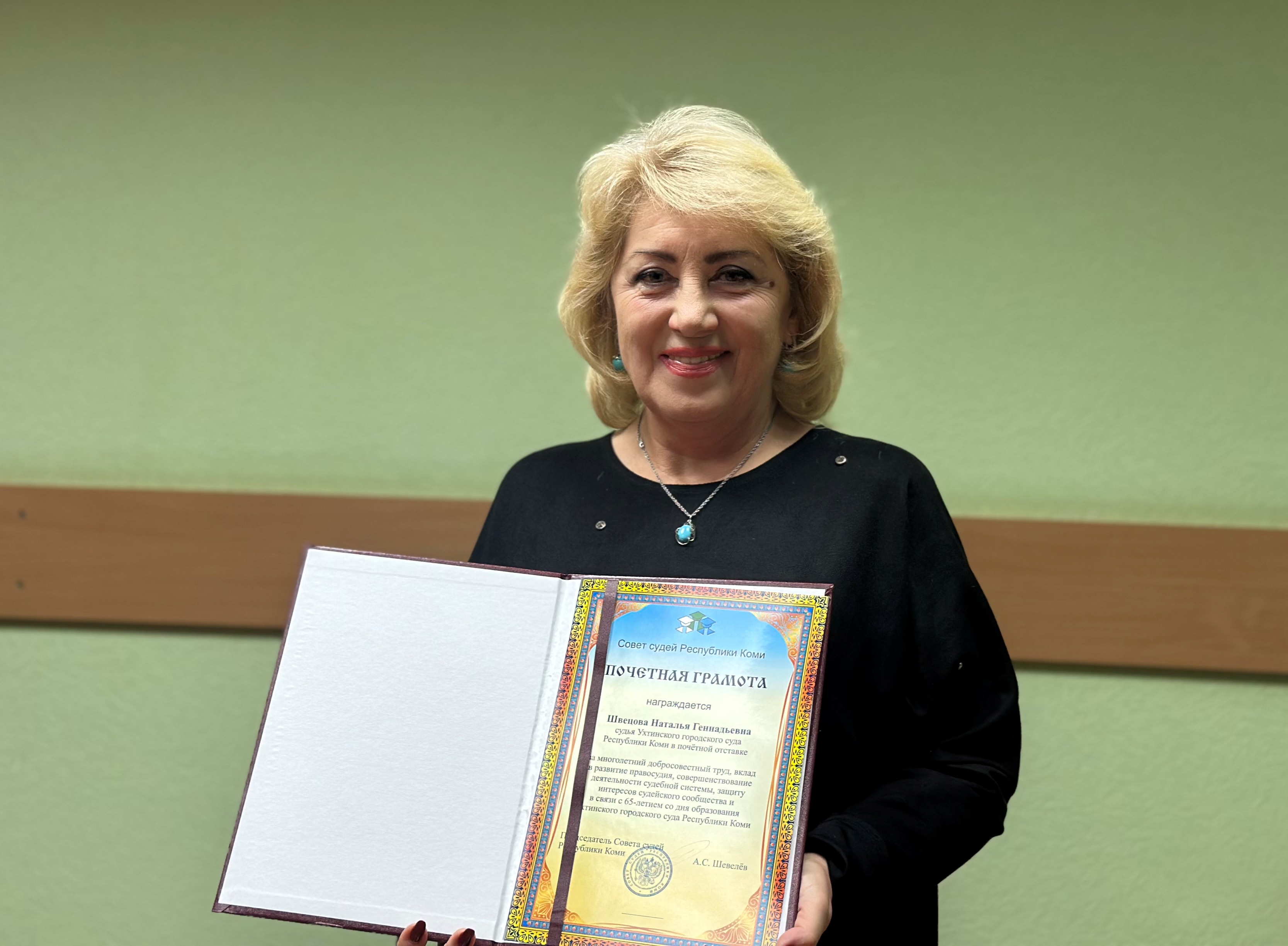 20 ноября 2025 года на общем собрании судей и работников аппарата Ухтинского городского суда Республики Коми, в торжественной обстановке председатель суда Пинчук Нина Владимировна вручила судье Ухтинского городского суда Республики Коми в почетной отставке Швецовой Наталье Геннадьевне Почетную грамоту Совета судей Республики Коми, награжденной за многолетний добросовестный труд, вклад в развитие правосудия, совершенствование деятельности судебной системы, защиту интересов судейского сообщества и в связи с 65-летием со дня образования Ухтинского городского суда Республики Коми. Наталья Геннадьевна была избрана народным судьёй и зачислена в штат Ухтинского городского народного суда Республики Коми с 22.03.1994. Указом Президента Российской Федерации от 05.05.1999 № 545 назначена судьёй Ухтинского суда, где проработала до 30.03.2007 года. По распределению обязанностей в суде Наталья Геннадьевна рассматривала гражданские дела, дела об административных правонарушениях, материалы. Стаж в судебной системе составляет 18 лет, в должности судьи - 13 лет. Выйдя в почетную отставку, Наталья Геннадьевна всерьез занялась живописью и внесла значительный вклад в организацию музейной, просветительской и общественной деятельности в суде. Кроме занятия живописью, Наталья Геннадьевна пишет стихи, создает очаровательных кукол, проводит мастер – классы по живописи. С 2022 года Наталья Геннадьевна является членом Творческого Союза художников России и членом Творческого Объединения художников города Ухты, ее работы были неоднократно представлены в выставочных залах нашего города. В 2023 году Натальей Геннадьевной в дар Центральной библиотеке города были переданы картины, которые представлены теперь в отделе обслуживания. В марте 2024 года в зале Центральной библиотеки г. Ухты в рамках библиотечного проекта «Я с вами говорю стихами…» состоялась презентация её первого персонального сборника стихов «Наедине со всеми…». В дар городской библиотеке Швецовой Н.Г. было передано несколько экземпляров сборника стихов, которые заняли достойное место в библиотечном фонде. В 2025 году Наталья Геннадьевна стала членом Творческого Литературного объединения города Ухты. С 19 июля по 15 августа 2025 года в Ухте прошла уже пятая по счету персональная выставка живописи Натальи Геннадьевны - «В гармонии с цветом», которая вновь порадовала своими неповторимыми произведениями жителей и гостей города. Кроме того, в этом году Наталья Геннадьевна выступила в роли художника-оформителя книги поэтессы из г. Ростов на Дону Валерии Салтановой - «В сто сердец», подарившая изданию множество уникальных иллюстраций. От имени всего коллектива Ухтинского городского суда и от себя лично Нина Владимировна поздравила Наталью Геннадьевну с заслуженной наградой и пожелала дальнейших успехов в творческой деятельности.